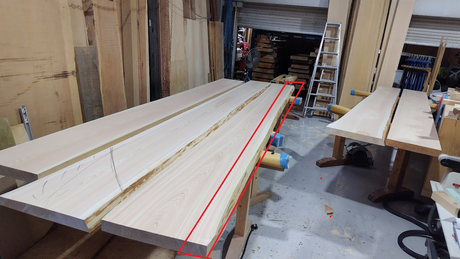 カウンターテーブルに使用する、檜の1枚板の成形のお手伝いに行ってきました。